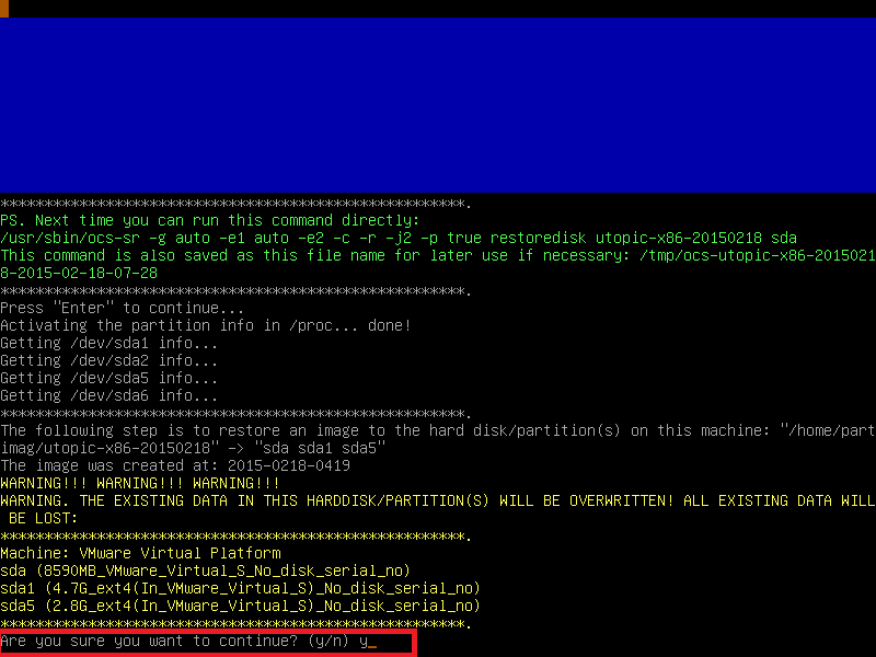 Ennenkuin Clonezilla alkaa tekemään prosessia, se pyytää kahdesti varmistusta. Kirjoita Y ja paina Enter molemmilla kerroilla, sen jälkeen se näyttää levyjen tiedot:
